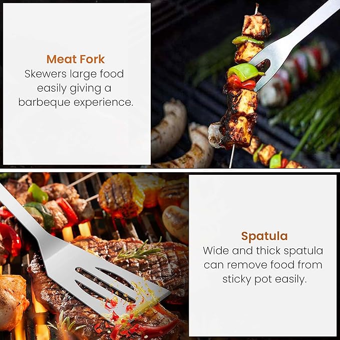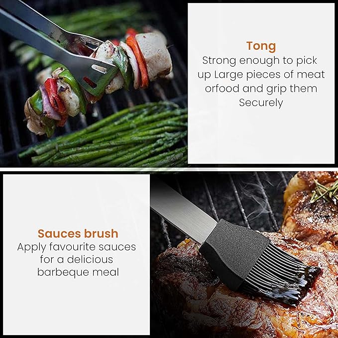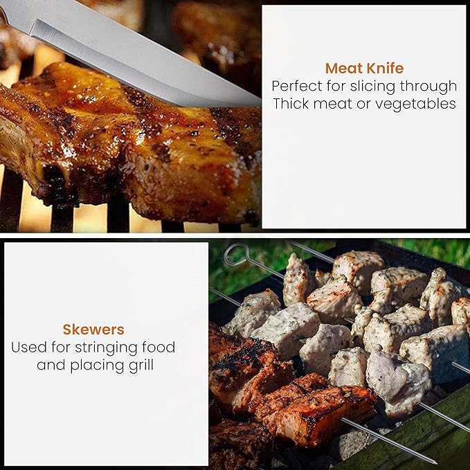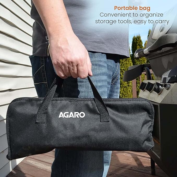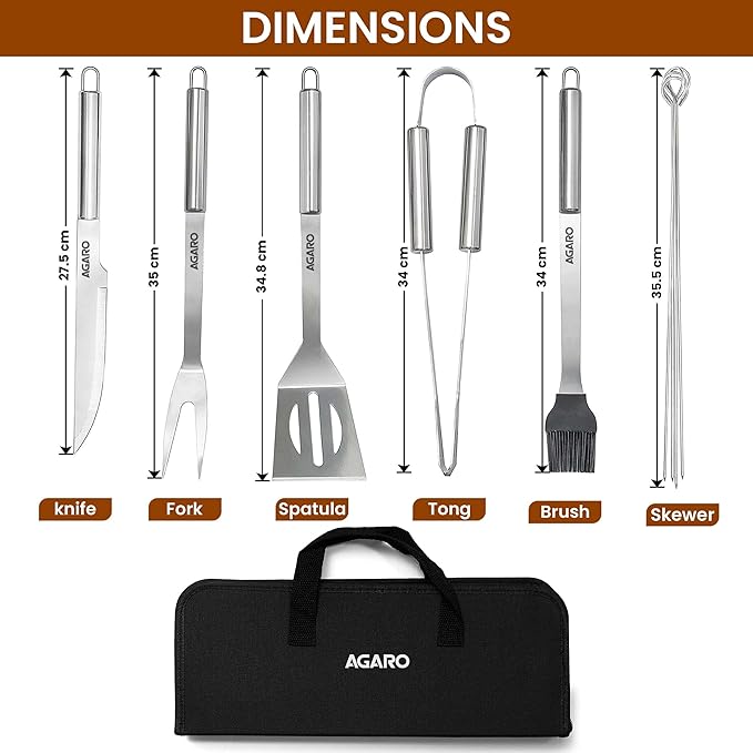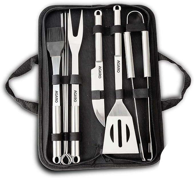 Agaroo Grand 9 Piece BBQ Tool Set, Durable Stainless Steel BBQ Accessories with Carrying Bag, Knife, Spatula, Tongs, Forks, Skewers, Basting Brush, Outdoor BBQ, Camping, Picnic, Silver