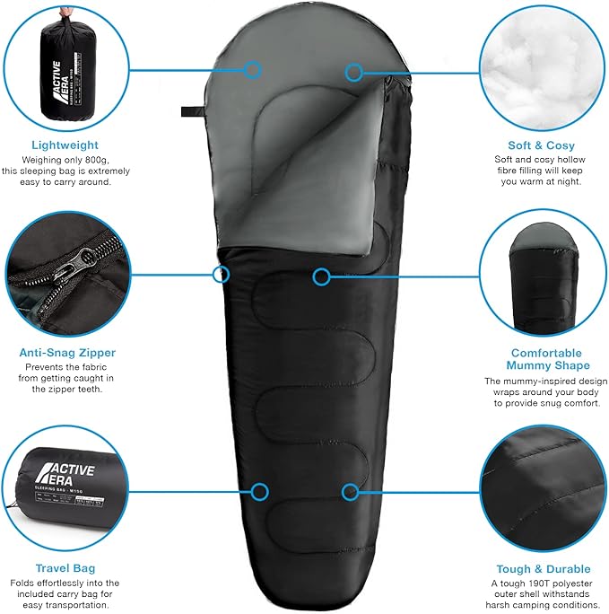 Active Era Sleeping Bag - Premium Lightweight Sleeping Bags for Adults & Kids - Festivals, Camping, Hiking & Outdoors - Includes Small Travel Bag