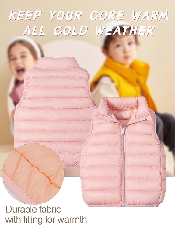 ✨【SUPERIOR COMFORT】: Made from a blend of 95% polyester and 5% spandex, this toddler puffer jacket is incredibly lightweight and soft, providing ultimate comfort for your little one. The cozy, fluffy material keeps them warm and cozy during the winter months, ensuring they stay comfortable all day long. ✨【EXCELLENT DURABILITY】: Made from high-quality materials, this puffer jacket is built to last. Its durable construction ensures it can withstand the wear and tear of everyday activities, making it perfect for active toddlers. Whether they’re playing outside or exploring inside, this jacket will keep up with their adventures. ✨【VERSATILE STYLE】: With its classic fit and solid color design, this toddler puffer jacket offers timeless, functional style. It features a stand-up collar, providing extra wind protection, and a sleeveless zipper design for easy on and off. This versatile piece can be effortlessly paired with sweaters, blouses, tops, jeans, leggings or boots, allowing your little one to create a stylish look for any occasion. ✨【PERFECT FOR VARIOUS ACTIVITIES】: This puffer jacket is waterproof and windproof, making it suitable for a wide range of activities such as skiing, snowboarding, camping, hiking and more. Additionally, it is lightweight and packable, making it convenient to carry and perfect for travel. Whether it's a family vacation or a birthday party, this jacket is a great choice. It also makes an excellent gift for Christmas or any other special occasion. 😊【AFTER-SALE SERVICE】: We offer different colors and sizes for you to choose from, every baby is unique, please refer to the size chart based on your baby's actual body measurement before purchasing, if you have any problems, please contact us by email first, we will reply you within 24 hours and help you solve the problems at once!