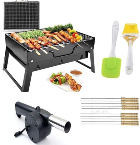 Charcoal Grill - Portable Foldable BBQ Grill (2 Spoons, 1 Grill, 10 Skewers, 1 Air Blower), Outdoor BBQ Tools for Camping, Hiking, Travel (BBQ)