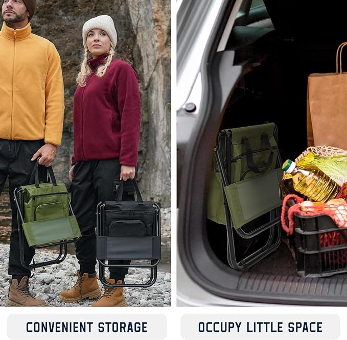 Fandango Small Fishing Chair with Cooler Bag, Lightweight Camping Chair with Backrest for Hiking, Travel, Hunting, Ice Fishing for Men, Supports 265lbs (Green)