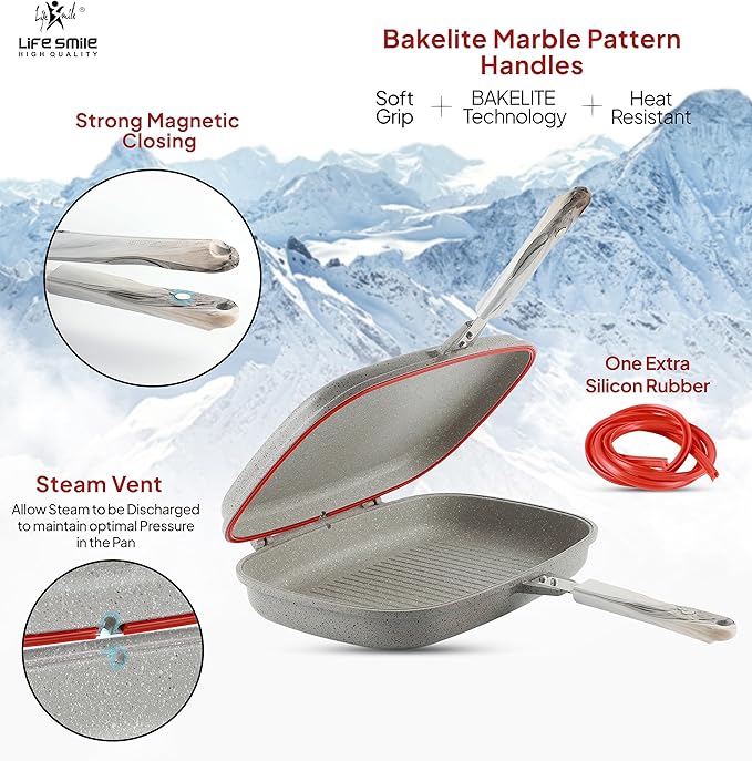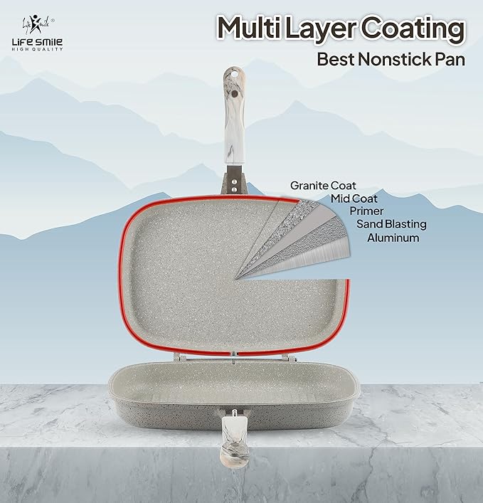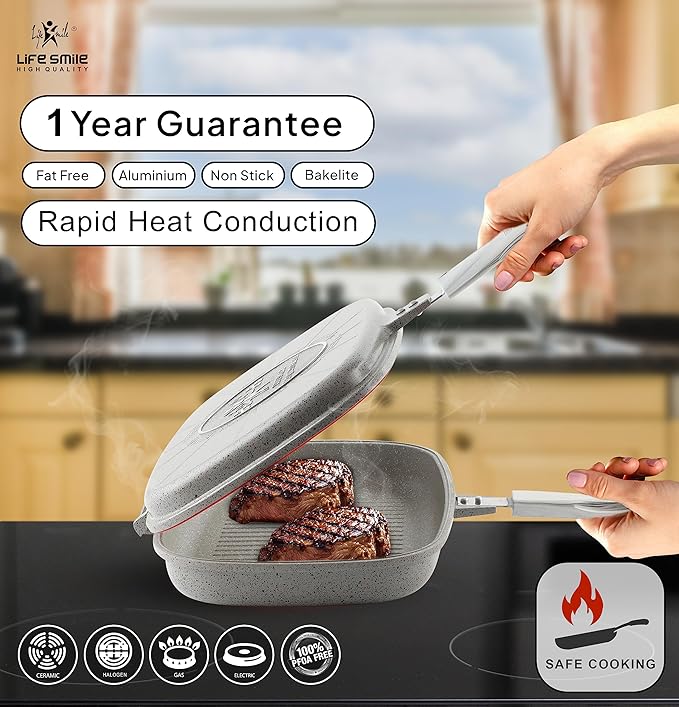 Life Smile 36cm Double Smart Grill Pan - Multi-Layer Granite Non-Stick Coating with Magnetic Handle - Flip Grill Pan | Multi-Stove Compatibility (Black)